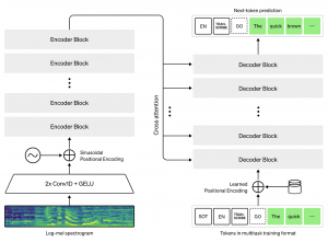 Whisper uses an encoder-decoder transformer architecture, sometimes referred to as a sequence-to-sequence model. This design is conceptually similar to the architecture used in language models like GPT-3 and translation models, but adapted for audio input rather than text. The entire pipeline can be broken down into an audio preprocessing stage, an encoder that processes acoustic features, and a decoder that generates text tokens.