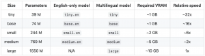 | Tiny | 39 M | 4 | 4 | 384 | 6 | ~1 GB | ~10x |