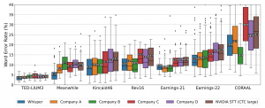 Figure 3. Comparison of Whisper's Word-error-rate (WER) with other models. Source: OpenAI.